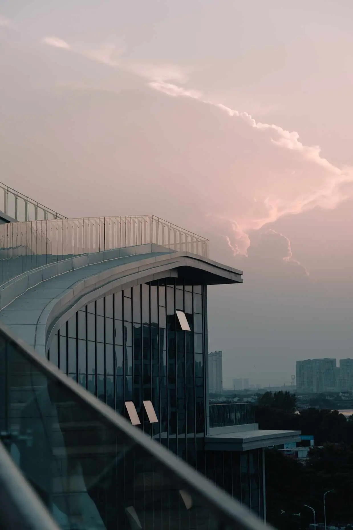建筑顶部曲线优美玻璃幕墙映衬天空云彩城市天际线