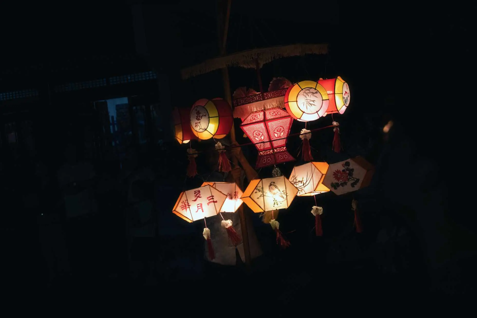 夜晚灯笼发出光芒 形状各异 颜色鲜艳 节日气氛浓厚