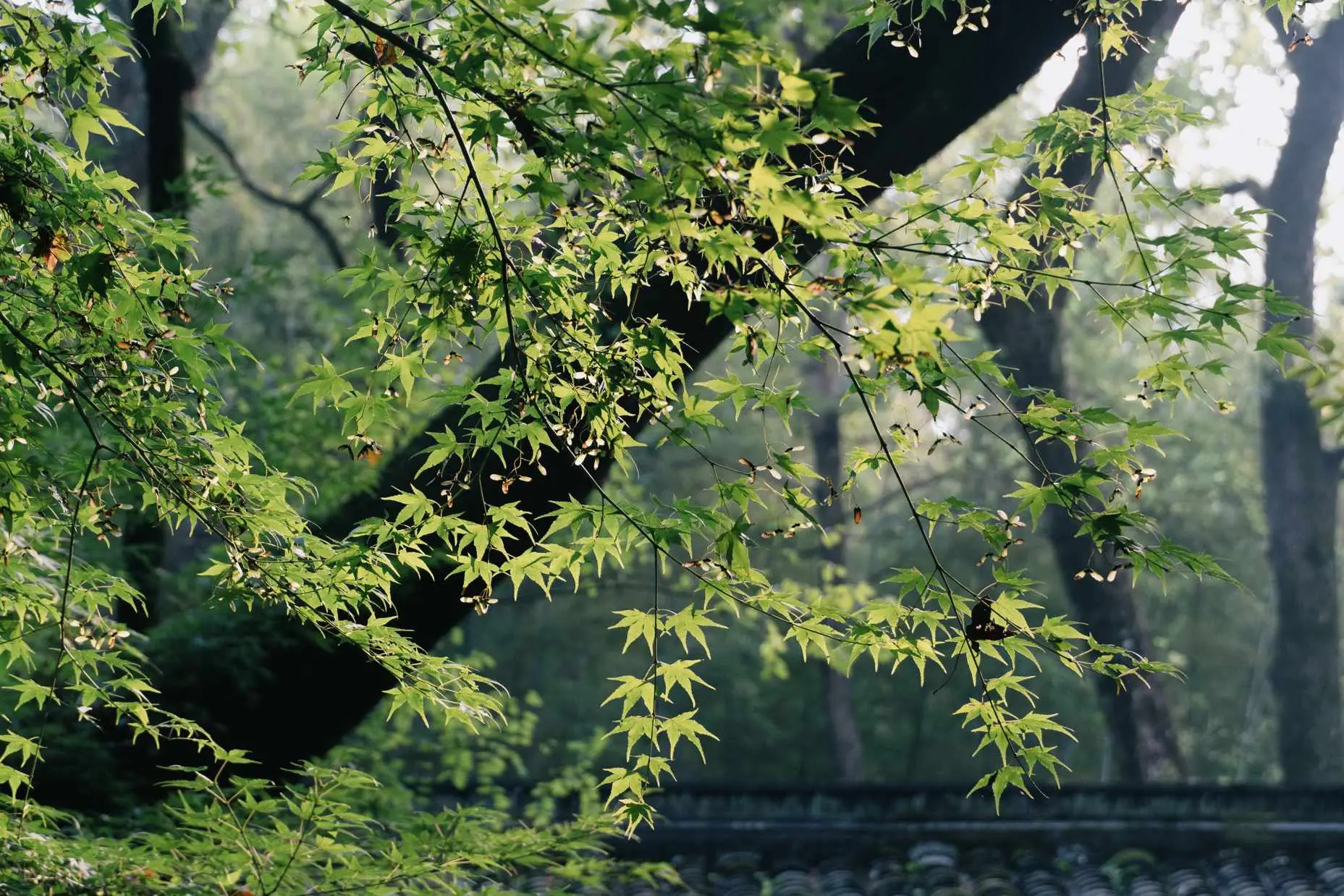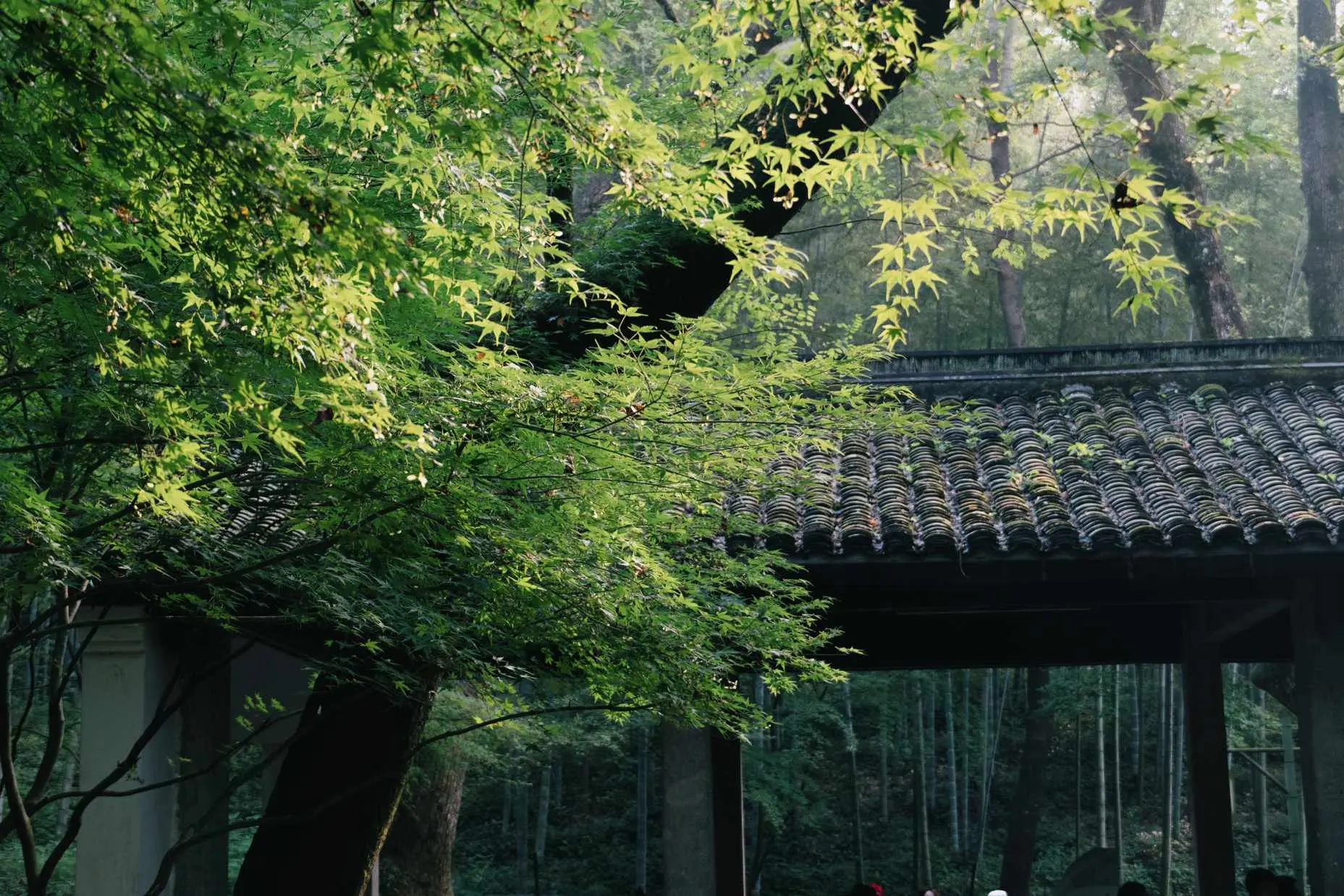 绿树掩映下的中式建筑 屋檐竹林光影交错